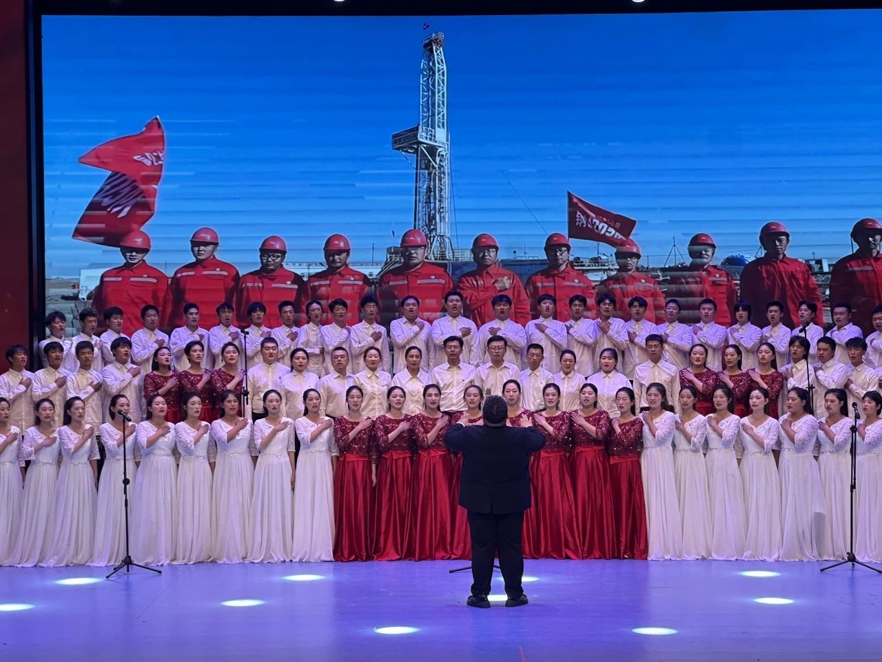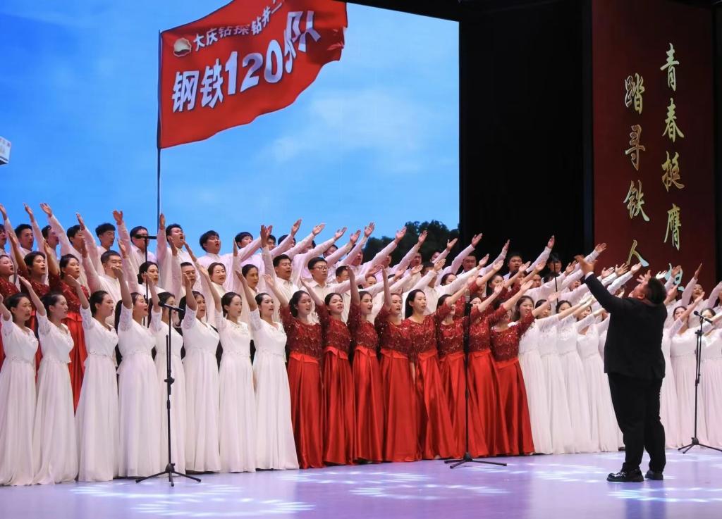 “宁可少活二十年,拼命也要拿下大油田。”情景剧及合唱同学们的喊声久久回荡在舞台上,《铁人之歌》铿锵有力的歌声震撼人心,仿佛带我们看到王进喜奋不顾身跳入泥浆中的场景。一曲结束,公司学子孙浩桐、牛萍用朗诵引出下一首曲目《中国一定强》,飘扬的红旗、激昂澎湃的歌曲、英姿飒爽的舞蹈,无一不在展现公司学子对祖国的美好祝愿与赞美之情。台下的掌声滚滚如雷,久久未曾停息,是对公司学子爱国热情的充分肯定。