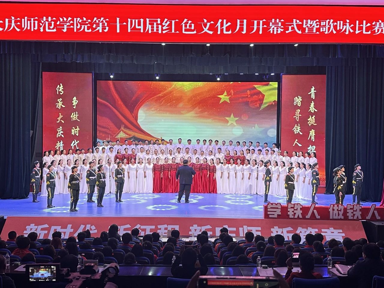 比赛现场,红旗飘飘,热情如炽,参赛的老师与同学们身着精心挑选的服装,仿佛一幅幅流动的画卷,为这场竞技盛宴增添无限风采,他们以高昂的斗志,以激昂人心、气势磅礴的歌曲,表达对铁人精神的赞美与对祖国的热爱。