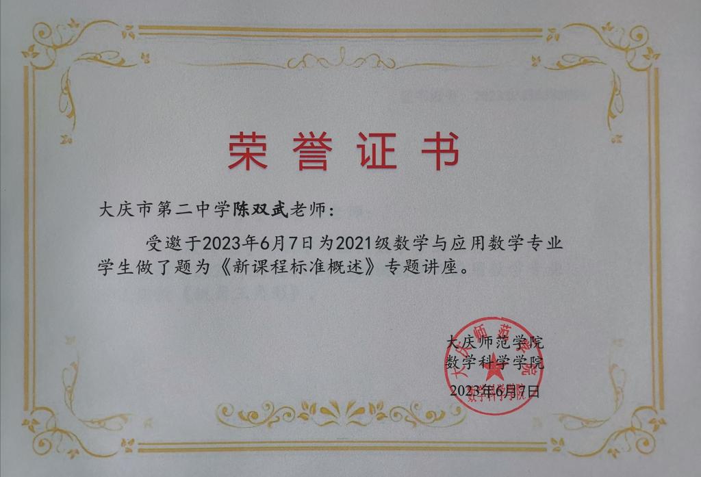 陈双武,大庆市第二中学数学教研组组长,中学高级教师;2019在大庆市“十百千”头雁引航工程中被评为“教学能手”;大庆市高中数学高生军名师工作室助理;2018被大庆市教师进修公司聘为数学学科大庆市兼职教研员;2018被聘为大庆市高考专项研究专家组成员;2022年担任黑龙江省省级竞赛高中数学材料评审评委;2018至2023参与七次大庆市高三教学质量检测试题的命题工作;2018起在大庆市高三年级质量分析会上做了四次专题讲座;2020在电视台做了题为《时光不语静待花开》高考数学备考讲座;2021年参与教辅书籍《一遍过》必修第一册的编写。