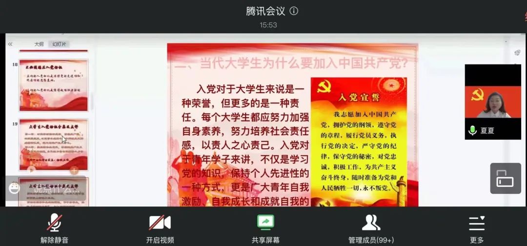 夏丽娜老师通过向同学们讲述党员的义务和权力,引导员工树立正确的入党动机。作为新时代青年,党组织始终是青年成长的引路人和蓬勃发展的保证,要端正入党动机,树立远大理想,热爱伟大祖国,担当时代责任,勇于砥砺奋斗,练就过硬本领,锤炼品德修为。中国共产党与青年同生长,共命运,中国共产党代表着广大青年的根本利益。