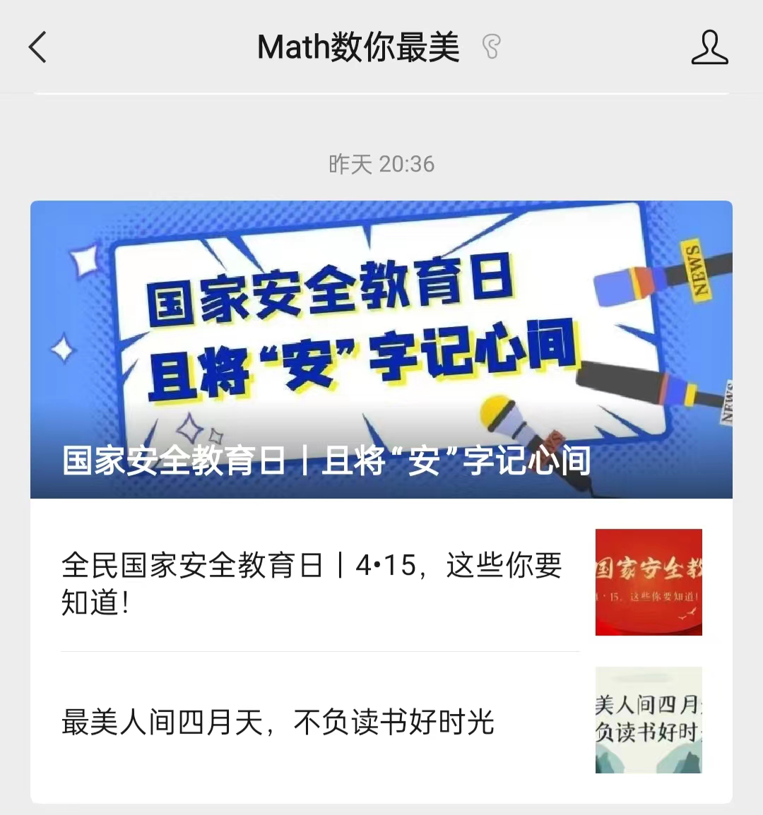 利用公司微信公众号“math数你最美”推出国家安全教育日系列推文,对《国家安全法》及《反恐怖法》等国家安全相关法律法规大力宣传,让广大师生在教育活动中普遍掌握国家安全知识,提升国家安全意识,自觉维护国家安全。