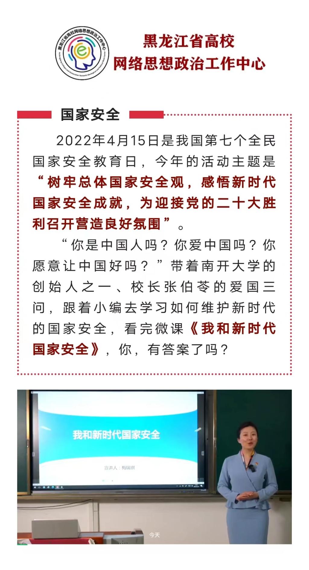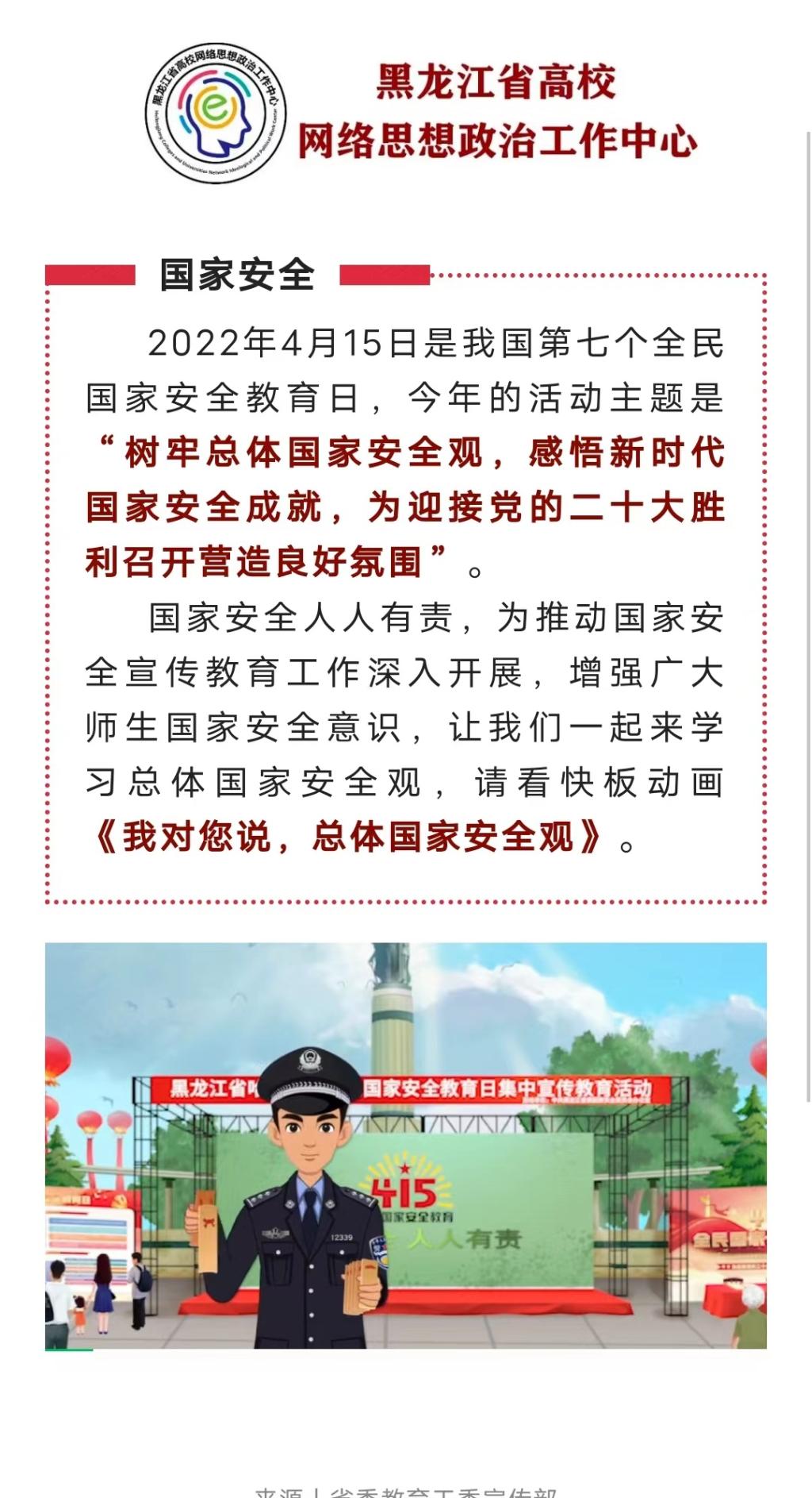 组织全体员工通过“龙江高校网络思政中心”微信公众号观看国家安全教育短视频和全民国家安全教育日的相关学习视频《我对您说,总体国家安全观》《我和新时代国家安全》等。