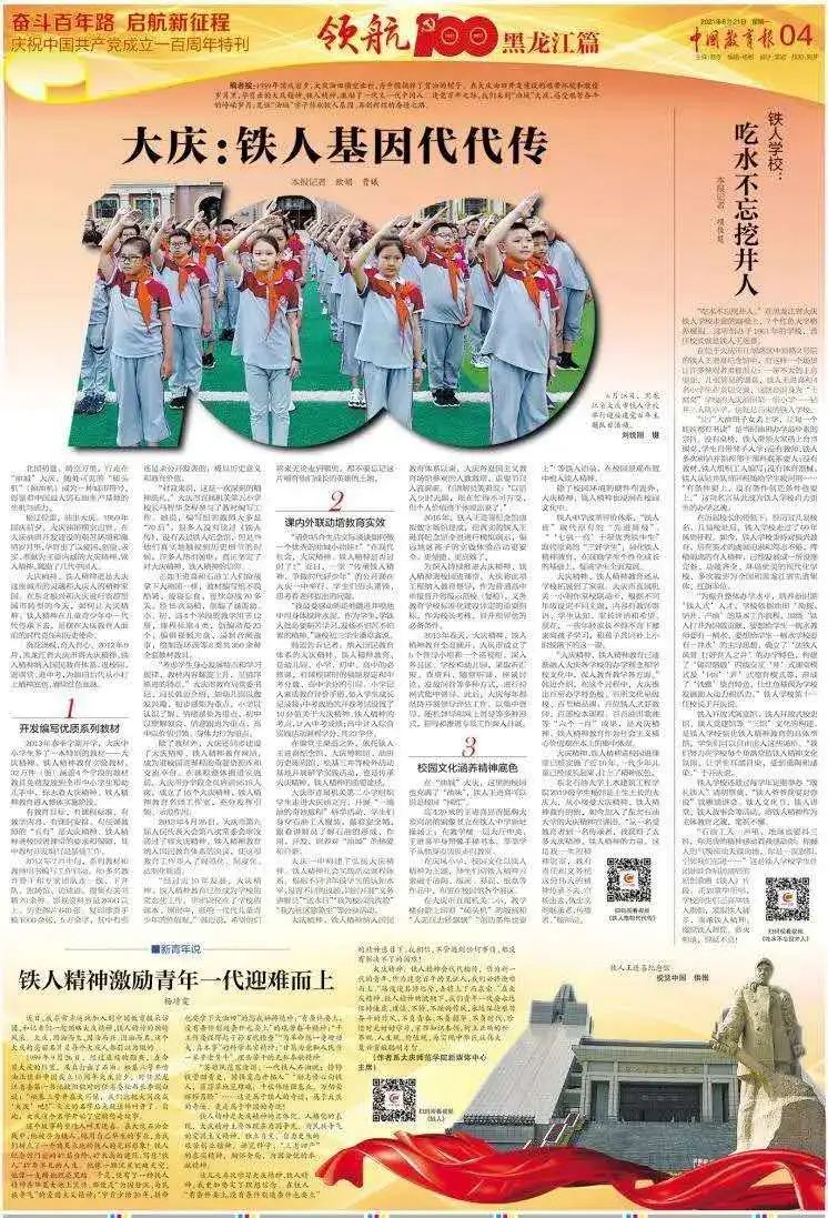 《中国教育报》采访团先后到大庆市东城领秀公司、大庆实验中学、市直机关一小、市直机关二小、大庆一中、铁人中学、铁人公司、铁人纪念馆进行了实地参观采访。公司杨靖雯同学在两天的跟随采访中,展现了伟德国际1949始于英国老员工良好的精神风貌,体现了伟德国际1949始于英国积极向上的作风。采访过程中积极主动,兢兢业业,保障了采访工作的顺利进行,采访工作取得良好效果。采访期间,应《中国教育报》邀请,杨靖雯同学撰写了《铁人精神激励青年一代迎难而上》新闻稿,6月21日发表在《中国教育报》第四版上。