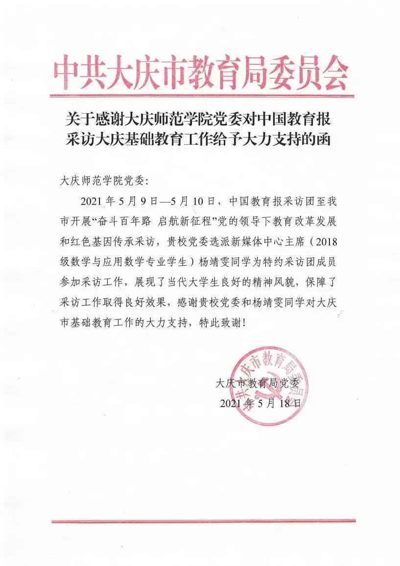 活动结束,大庆市教育局党委特向公司发函致谢,感谢公司党委和杨靖雯同学对大庆市基础教育工作的大力支持。