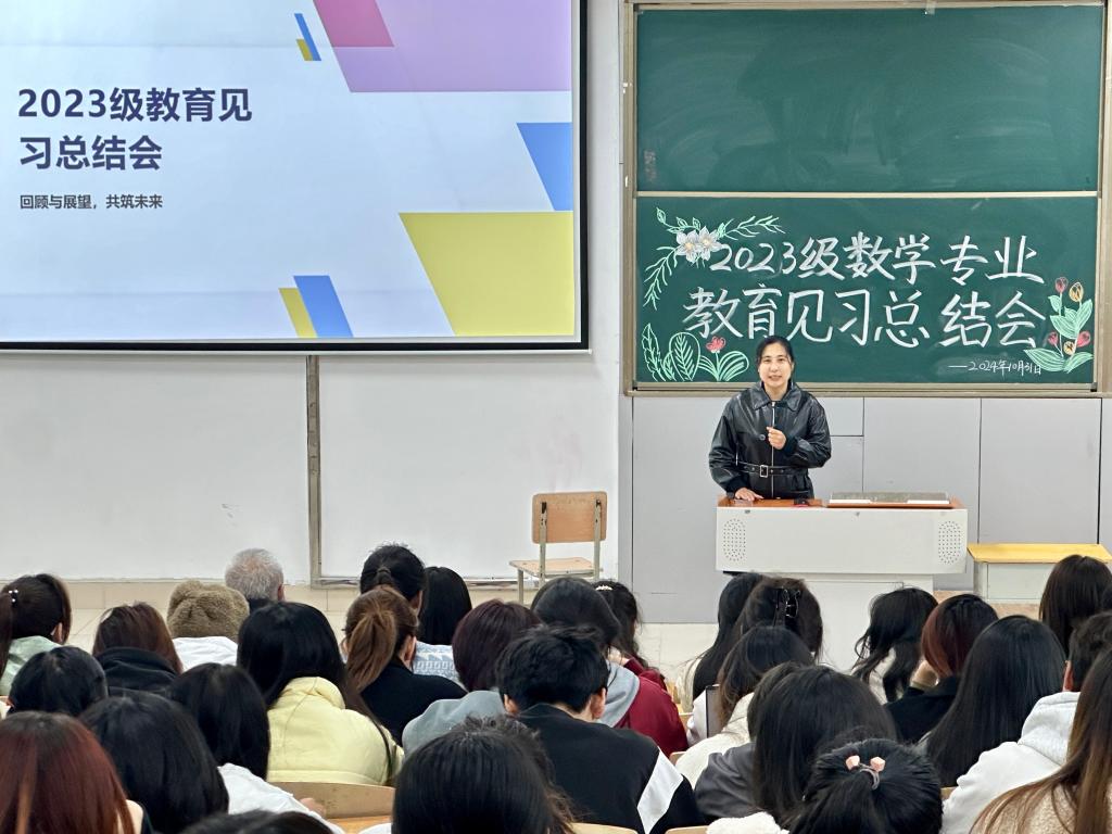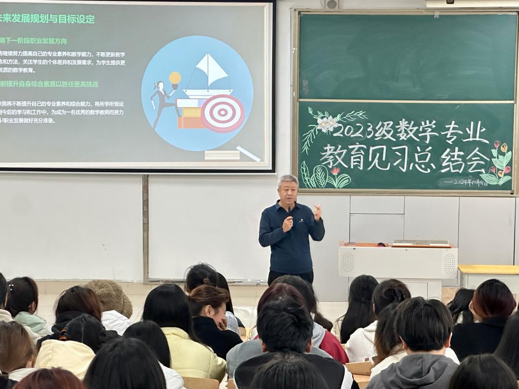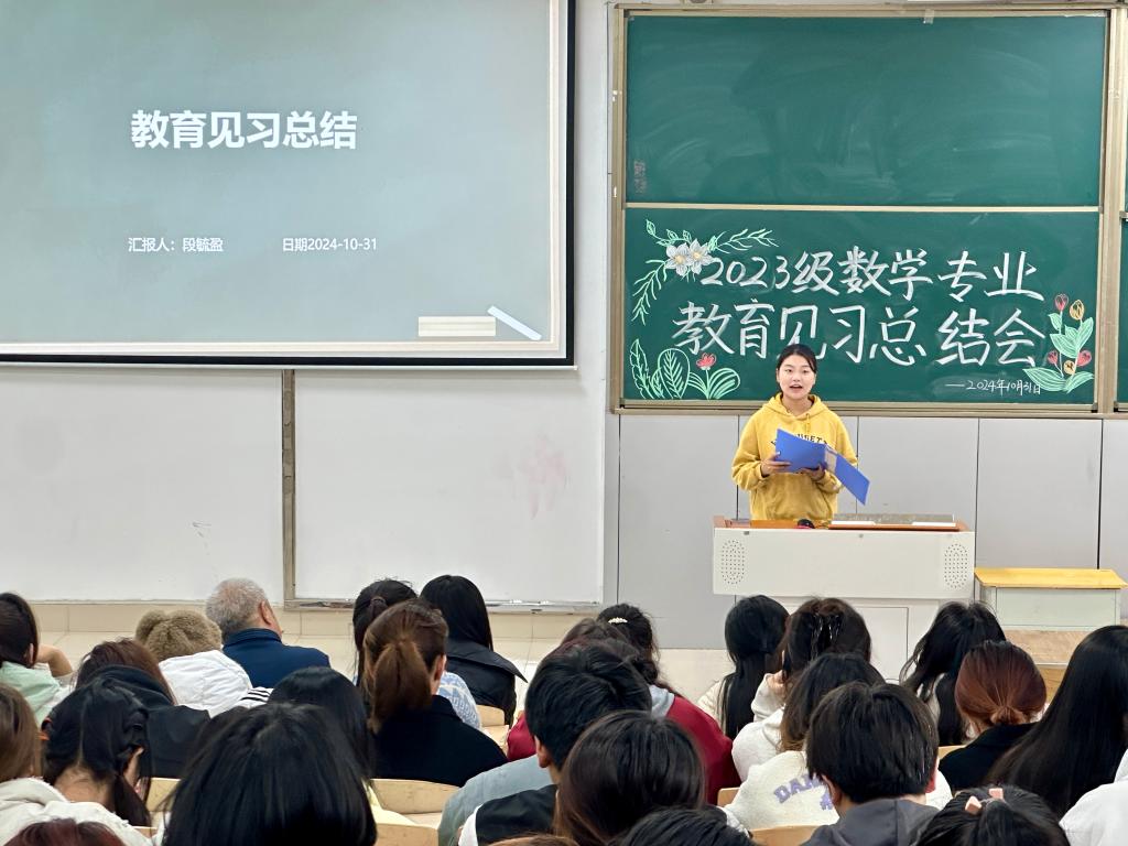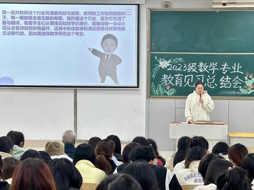 2024年10月21日-2024年10月25日,数学与应用数学专业2023级深入大庆市第三十六中学、大庆市景园中学、大庆市第三中学、大庆中学、大庆市嘉诚公司开展了为期一周的教育见习活动。为了更好提升员工的实践能力,总结同学们在见习期间的感悟与体验,伟德国际1949始于英国于10月31日下午13:30在主楼教室1-1举行2023级教育见习总结大会,由伟德国际1949始于英国副经理沙元霞主持,2023级员工及指导教师参加。