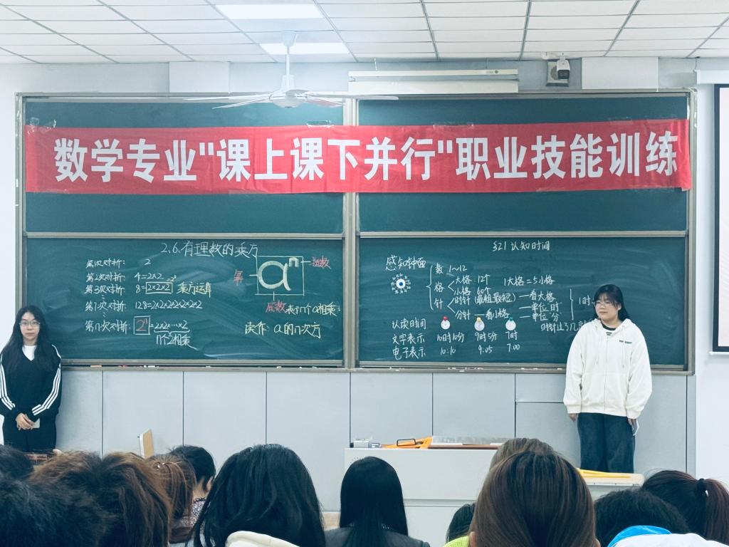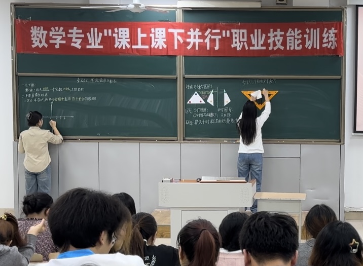 板书设计大赛采取现场比赛的形式,包含规范汉字书写和板书设计两部分内容。规范汉字书写主要考查参赛选手们的汉字书写基本功,旨在提升数学师范生从师技能,板书设计环节由参赛选手结合中学数学某一课时知识点进行设计并展示,利用板书书写突破教学重难点参赛选手有的将各种道具与板书相结合、有的对数学定义、数学性质中的重点内容合理运用颜色的粉笔进行标注,有的通过列表对函数性质进行总结。参赛选手的精彩展示赢得了评委的好评。