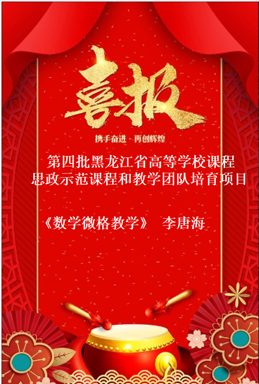 近日,黑龙江省教育厅公布黑龙江省高等公司第四批课程思政示范课程和教学团队培育项目、第二批课程思政优秀教学案例遴选结果,公司李唐海教授申报的《数学微格教学》课程获批省课程思政示范课程和教学团队培育项目。