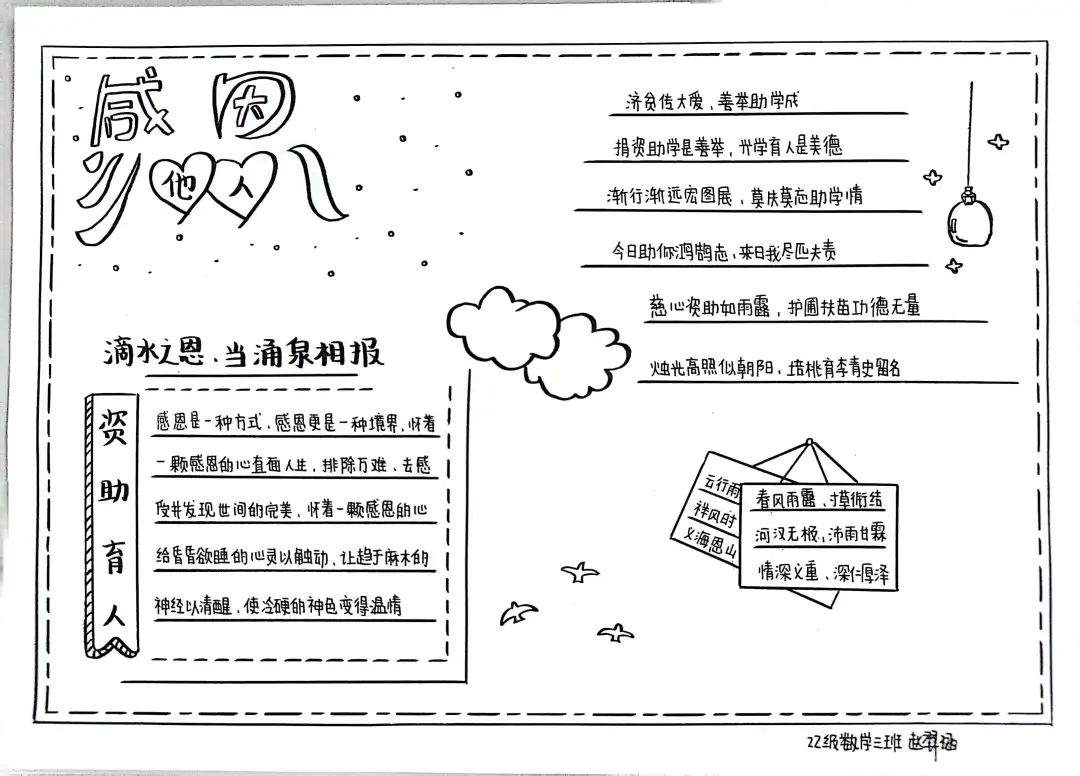 活动期间,同学们踊跃的报名参加活动,充分发挥自己的想象能力、绘画能力,以他们自己独特的想法去表达对于“感恩于心,诚信于行”活动主题的认识,提交了一幅幅生动有趣又富有寓意的作品。这些作品围绕诚实守信,感恩资助的内容进行,版面设计灵活,色彩鲜艳,内容鲜活,体现出同学们对诚信教育、感恩教育的深刻理解,也展现出同学们对待生活懂得心怀感恩、自立自强的生活态度。