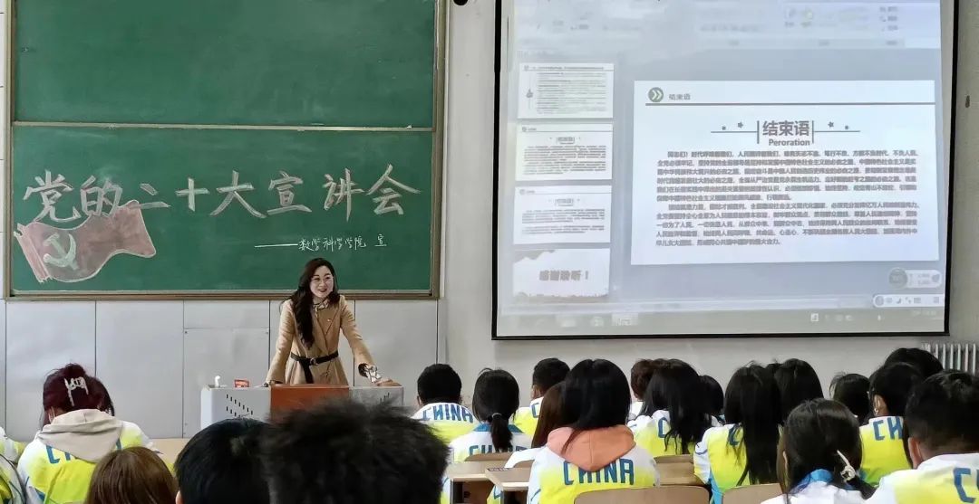 会上,夏丽娜老师以十五个章节进行讲述,为我们清晰地描绘了中国特色社会主义的总任务,在新时代更好坚持和发展中国特色社会主义,她告诉我们旗帜指引理想、奋斗铸就丰碑,我们青年一代是中华民族伟大复兴的见证者,更是推动者,我们肩负着“强国一代”的历史责任,我们责无旁贷。