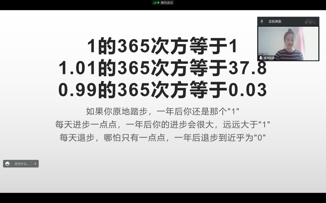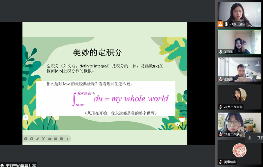 首先由21级数学三班的闫向茹为大家带来的课程。她通过三个式子所得到的答案,揭示了数学带给我们的道理:努力的意义。