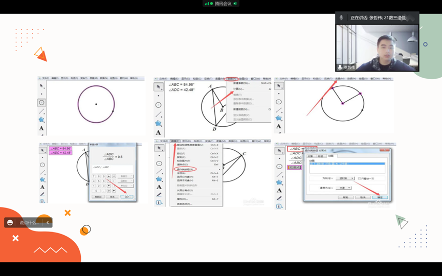 优势一:动态性,可以用鼠标拖动图形上任一元素(点、线、圆),而事先给定的所有几何关系(即图形的基本性质)都保持不变,这样更有利于在图形的变化中把握不变,突破了传统教学的难点;