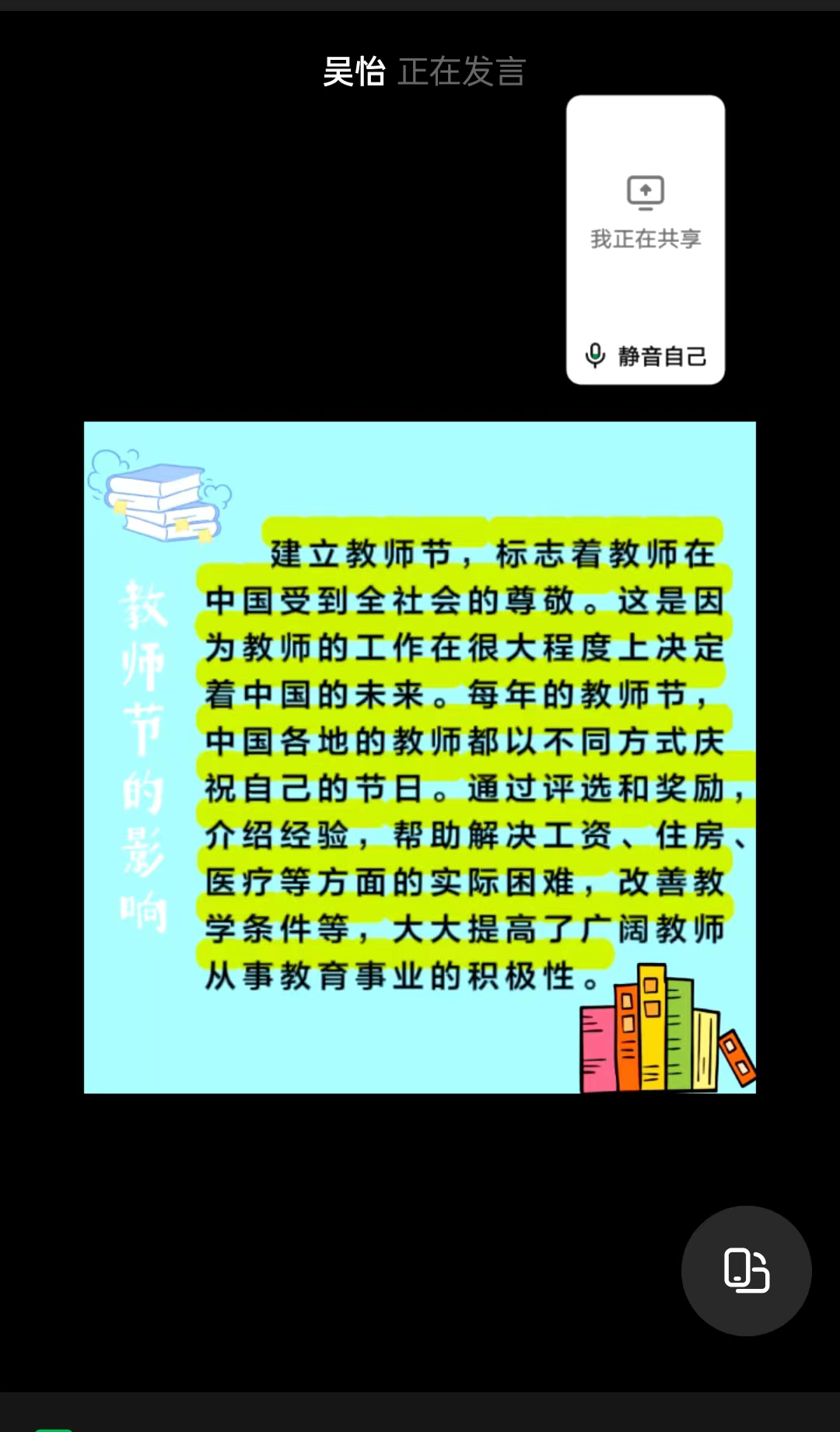 部分同学分享了自己印象深刻的老师,在这条艰难的求学路上,老师们总会用各种方式陪伴着你走到最后,带领你披荆斩棘,克服一切艰难险阻。同学们声情并茂的讲述,感慨一路以来的成长。在班会最后,我们了解了教师节的衍生文化和社会影响。