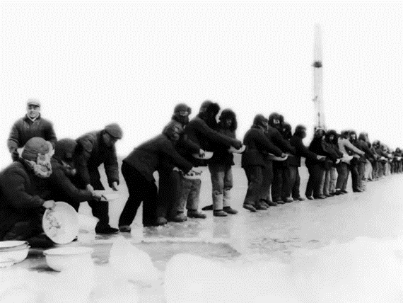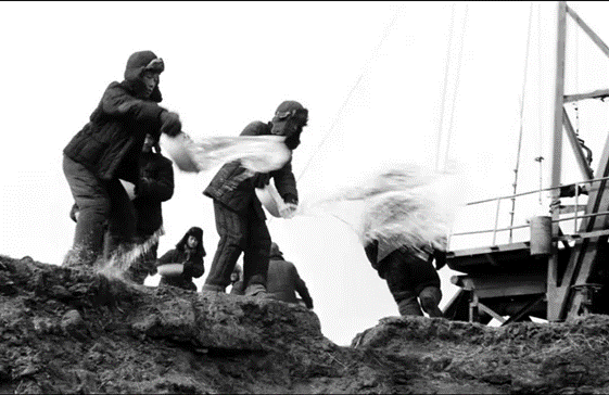 大家找脸盆、借扁担、水桶,动手端水、挑水。为了早日开钻,王进喜就带领全队职工到距井场一公里外的水泡子,把厚厚的冰砸开一个大窟窿,盆端、桶提,连铝盔、灭火器外壳也用来装水运水。天渐渐黑了下来,大家点起马灯,燃起火把,挑灯夜战。经过一天一夜的艰苦奋战,终于端足了50多吨水。