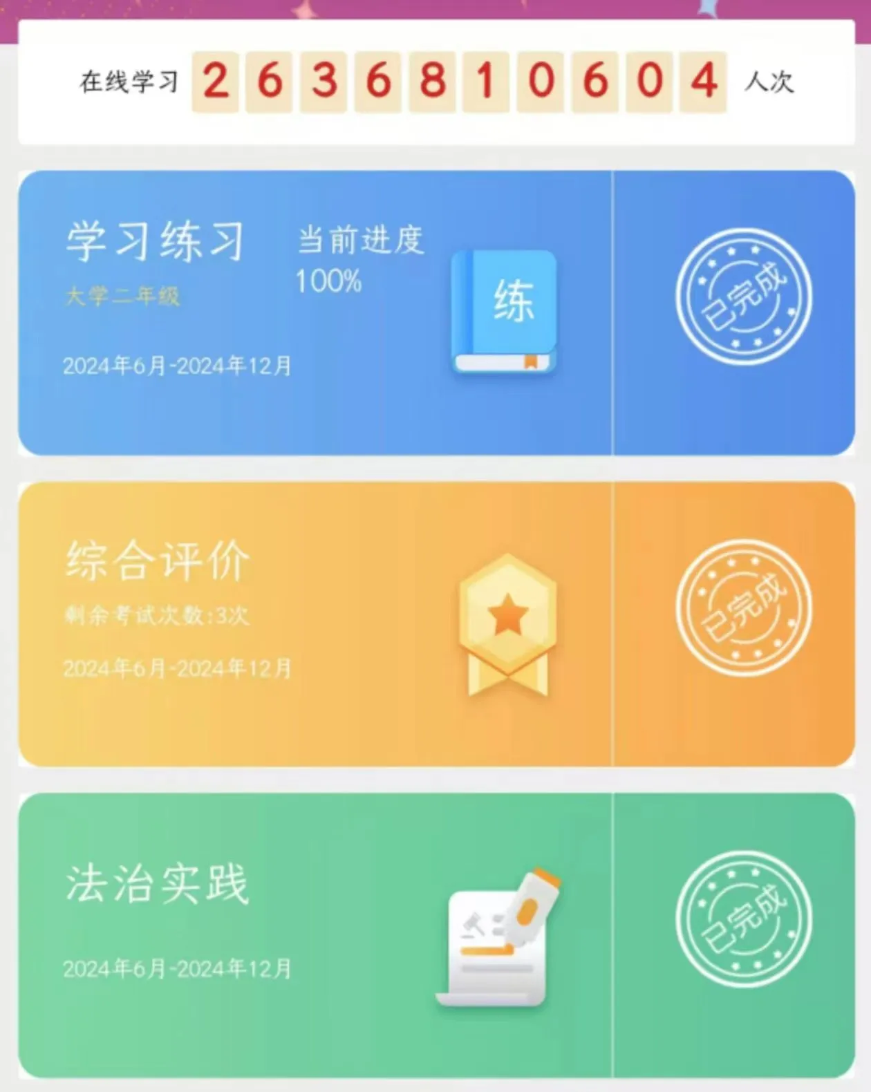 同学们在个人学习宪法打卡活动中,态度认真,每天坚持打卡。通过个人学习宪法打卡活动,同学们能够持续深入地学习宪法知识,养成自觉学习宪法的习惯,提升对宪法重要性的认识,增强法律素养和法治思维。