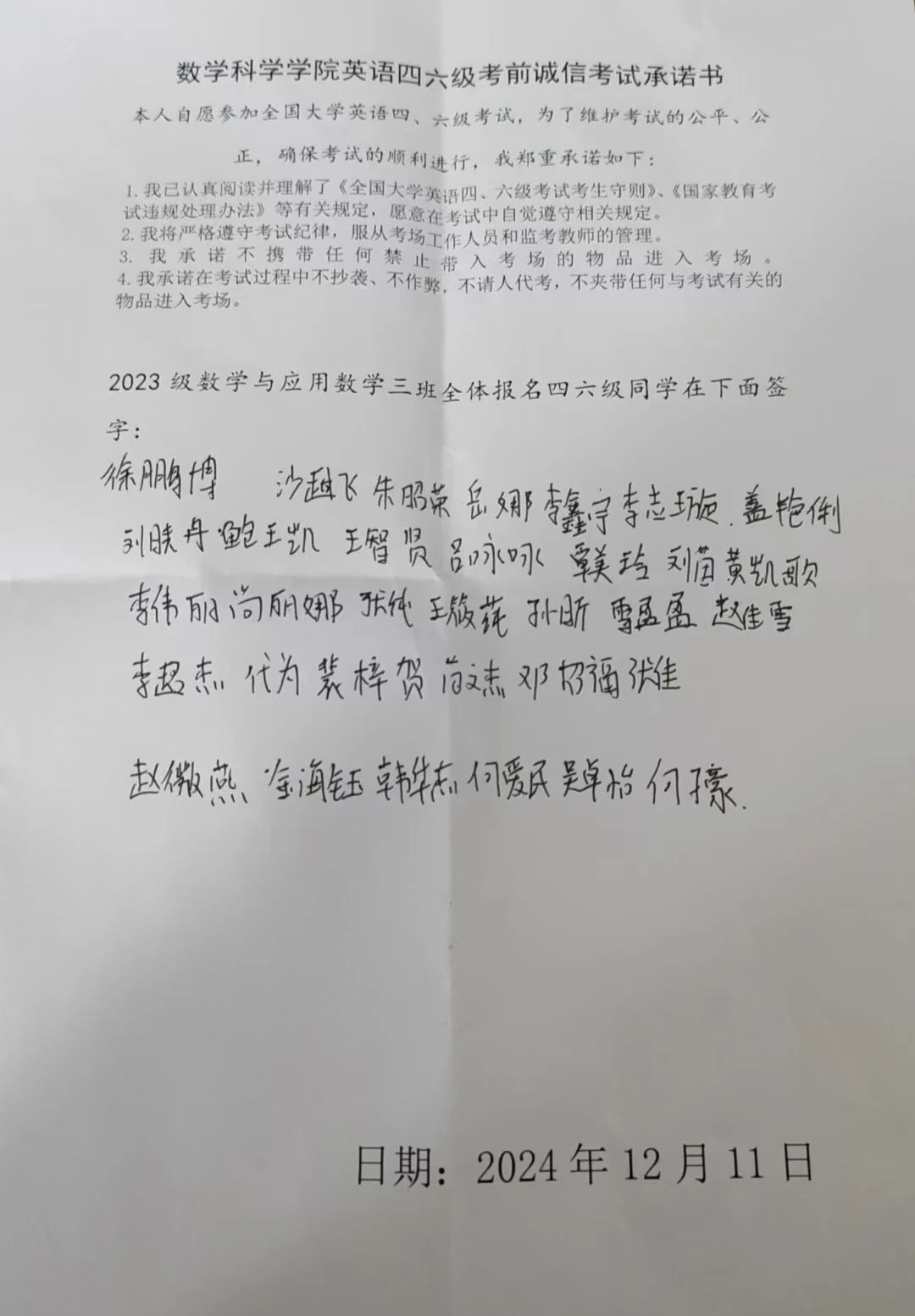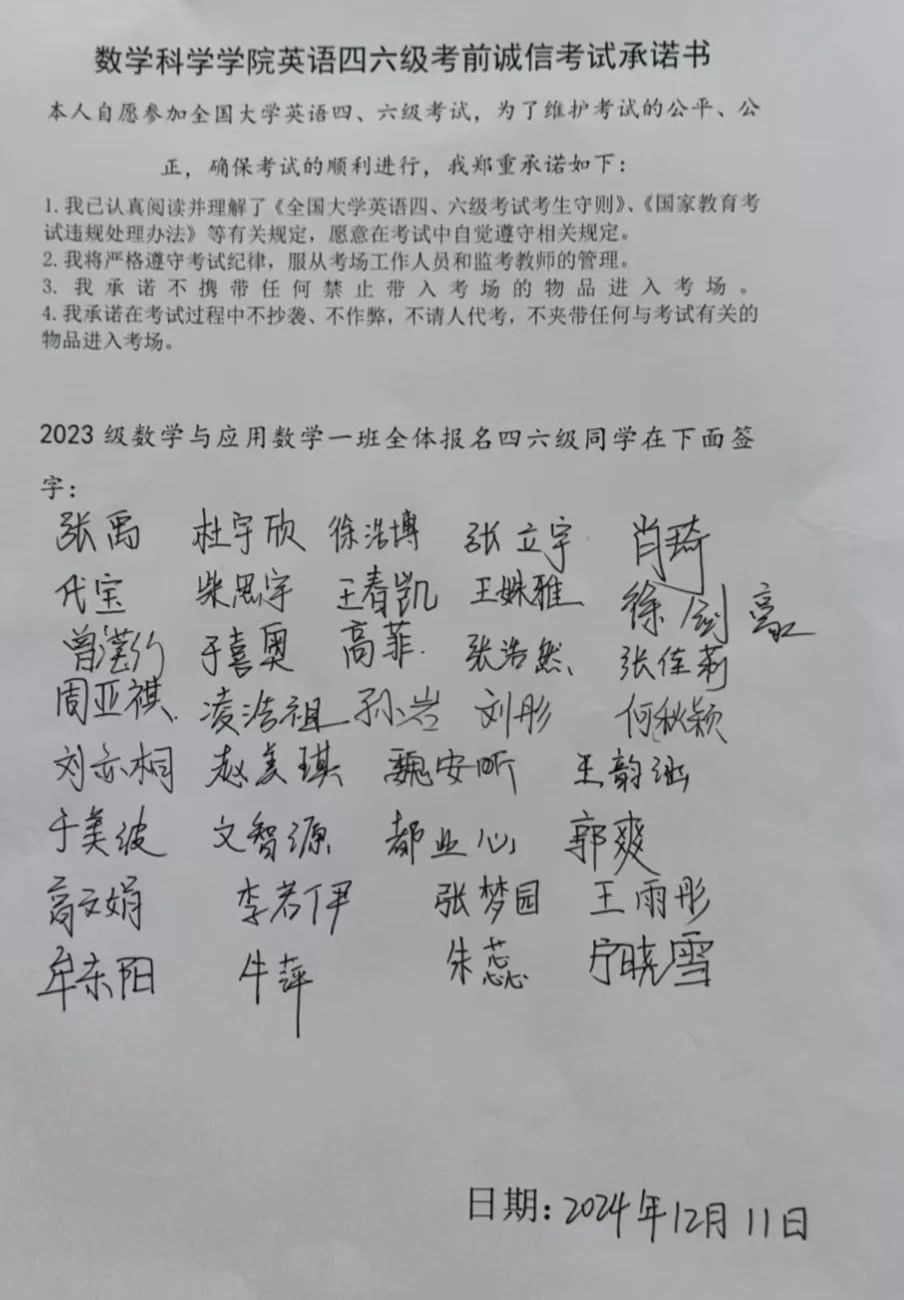 此次四六级考试承诺书的签署,绝非流于形式的表面文章,而是一种极具深意的教育策略,卓有成效地促进员工诚信意识的内化与自律能力的养成。拿到承诺书时,同学们仔细阅读承诺书涵盖的具体内容并领悟其背后所蕴含的重要意义,也认识到诚信考试绝非仅仅关乎个人学业成绩的优劣,实则是对学术道德底线的坚定守护与秉持。他们在承诺书上签下自己的名字,深知这是一场容不得丝毫欺瞒和严肃的考试。