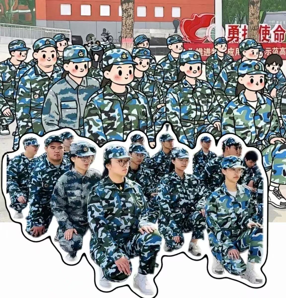 还有同学比耶的合照,现实里活力满满,Q版里小人儿们举着小拳头、比着剪刀手,笑容都要从卡通脸蛋里溢出来,把军训的快乐都定格住~